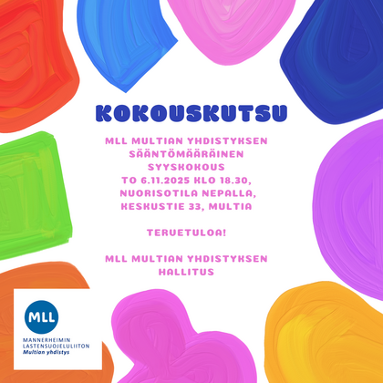 Tervetuloa Mannerheimin Lastensuojeluliiton Multian yhdistyksen sivuille. Järjestämme erilaisia tapahtumia ja tempauksia paikallisesti. Toimitaan yhdessä lasten, nuorten ja lapsiperheiden hyväksi! Meitä voit seurata myös Facebookissa.
